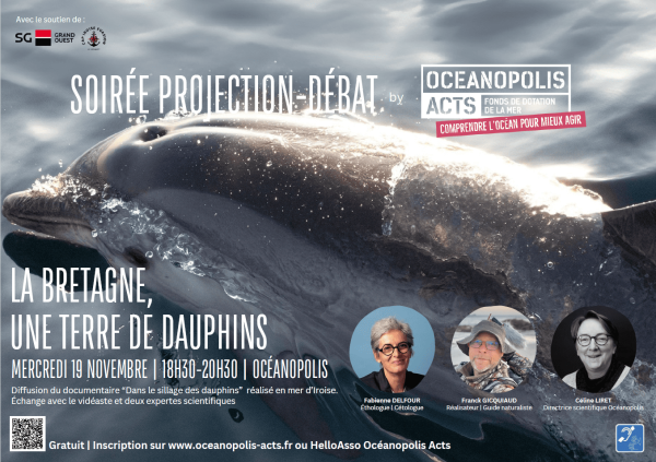 Mercredi 19 novembre 2025, le fonds de dotation Océanopolis Acts, en partenariat avec la Société Générale Grand Ouest, organise une soirée projection-débat sur les dauphins en Bretagne.