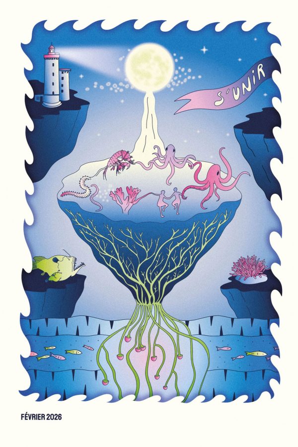 Pour le mois de février, la carte postale met en scène l’interprétation d’Adèle Mahé de l’union dans la matière, chez le vivant et les humains : un bal incongru à la lumière du phare du Petit Minou, entre terre et mer et au rythme du cycle de la lune.